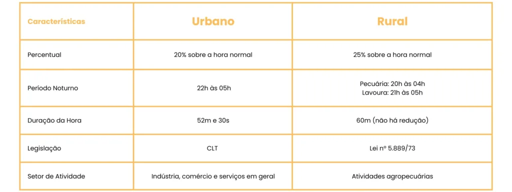 A principal diferença entre o adicional noturno rural e o urbano está na definição do período noturno e no percentual de acréscimo.
